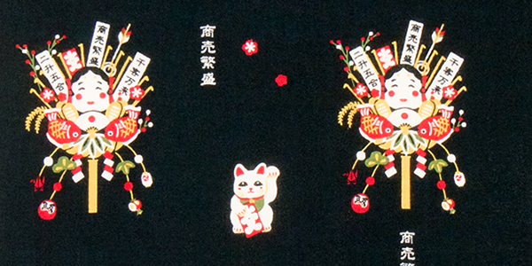 熊手に招き猫、商売繁盛の縁起物を描きました。