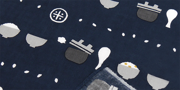 お釜で炊いたご飯や器に、米粒や紋を並べたデザイン。