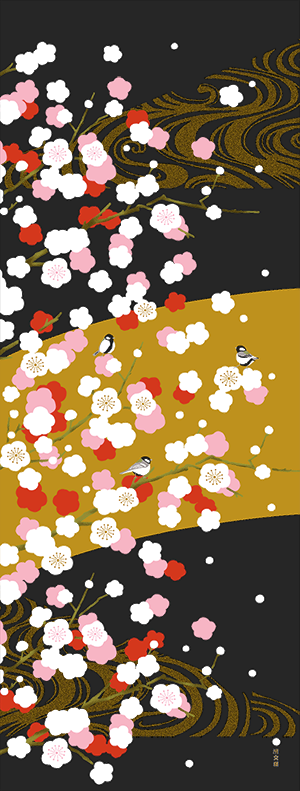 『絵てぬぐい 紅白梅に四十雀』