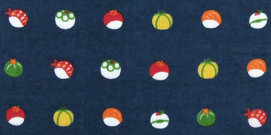 落ち着いた紺色の生地にカラフルなネタが映える粋な1柄。