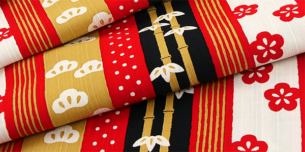 縁起の良い松竹梅を縞もように構成。